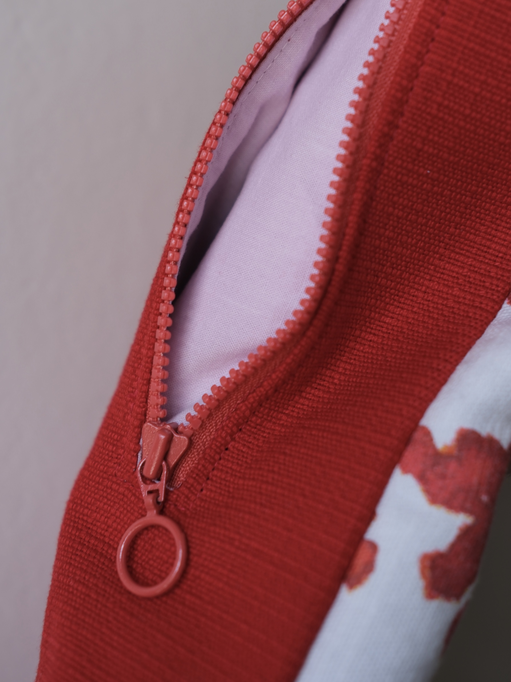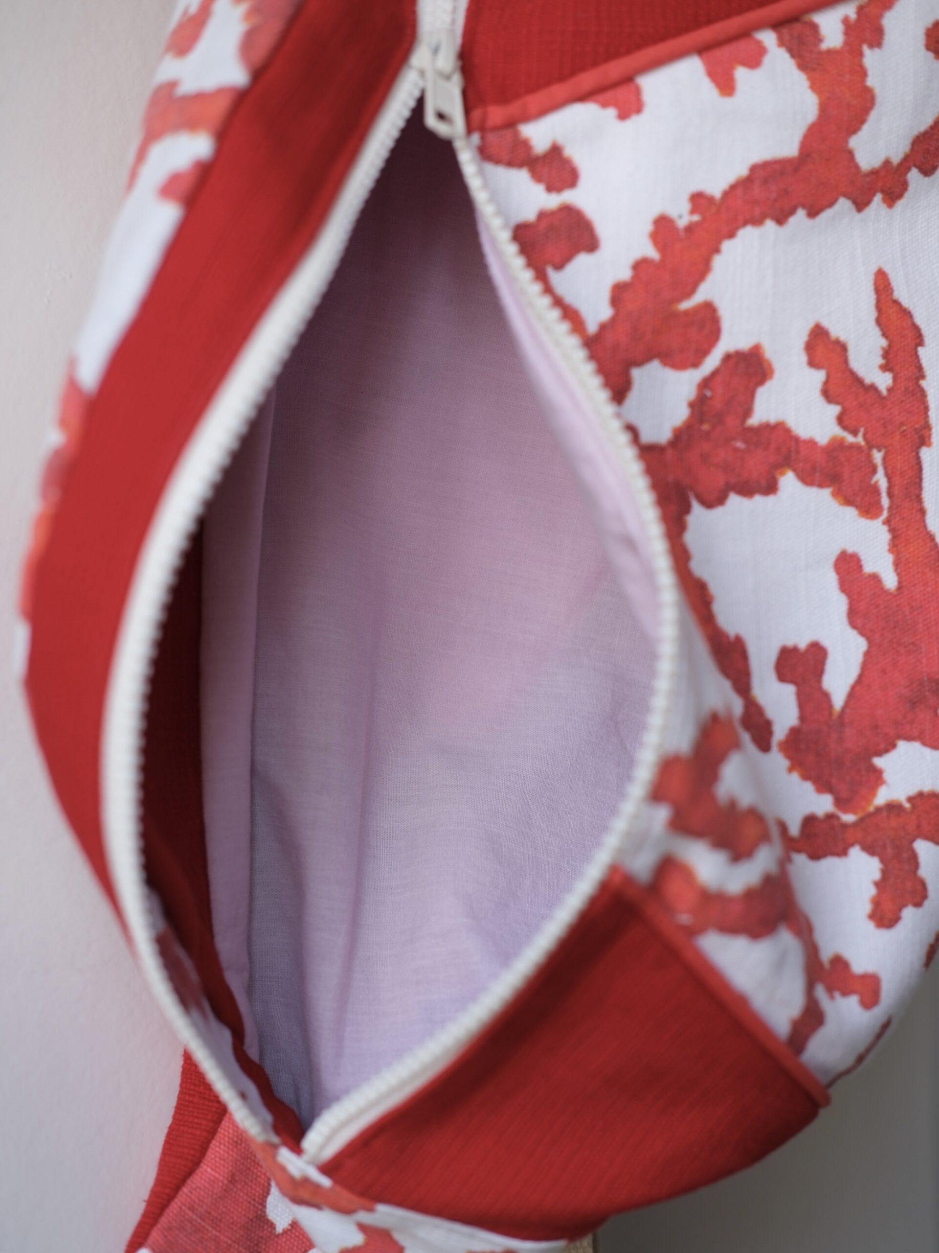 Again, this plain red upholstery fabric is paired with an old double curtain in coral-print cotton. The advantage of double curtains is that they are thick, large-sized upholstery fabrics, and if they are also old fabrics, the quality is undeniable compared to current fabrics. The coral print calls to mind the holiday sun 🙂