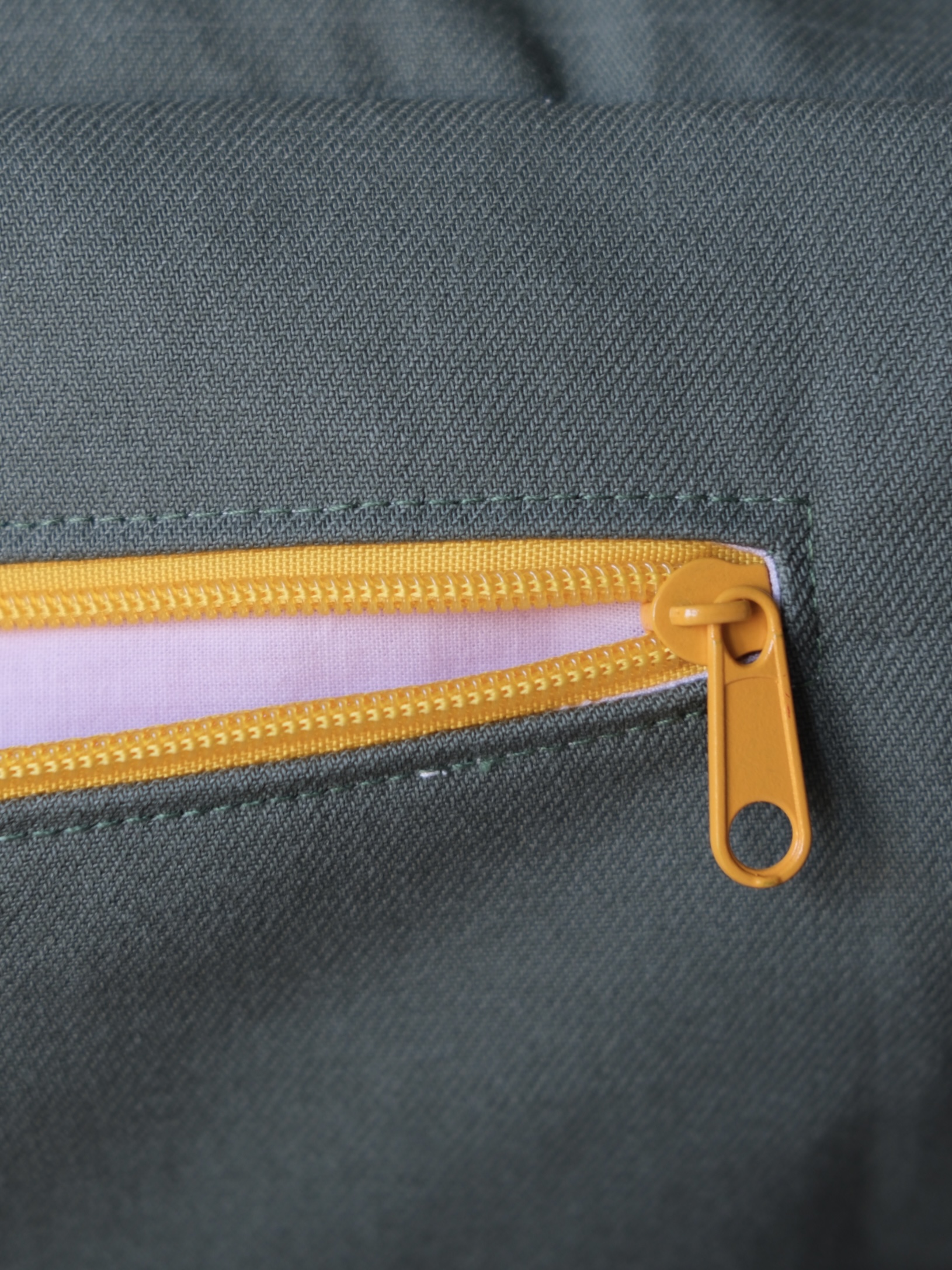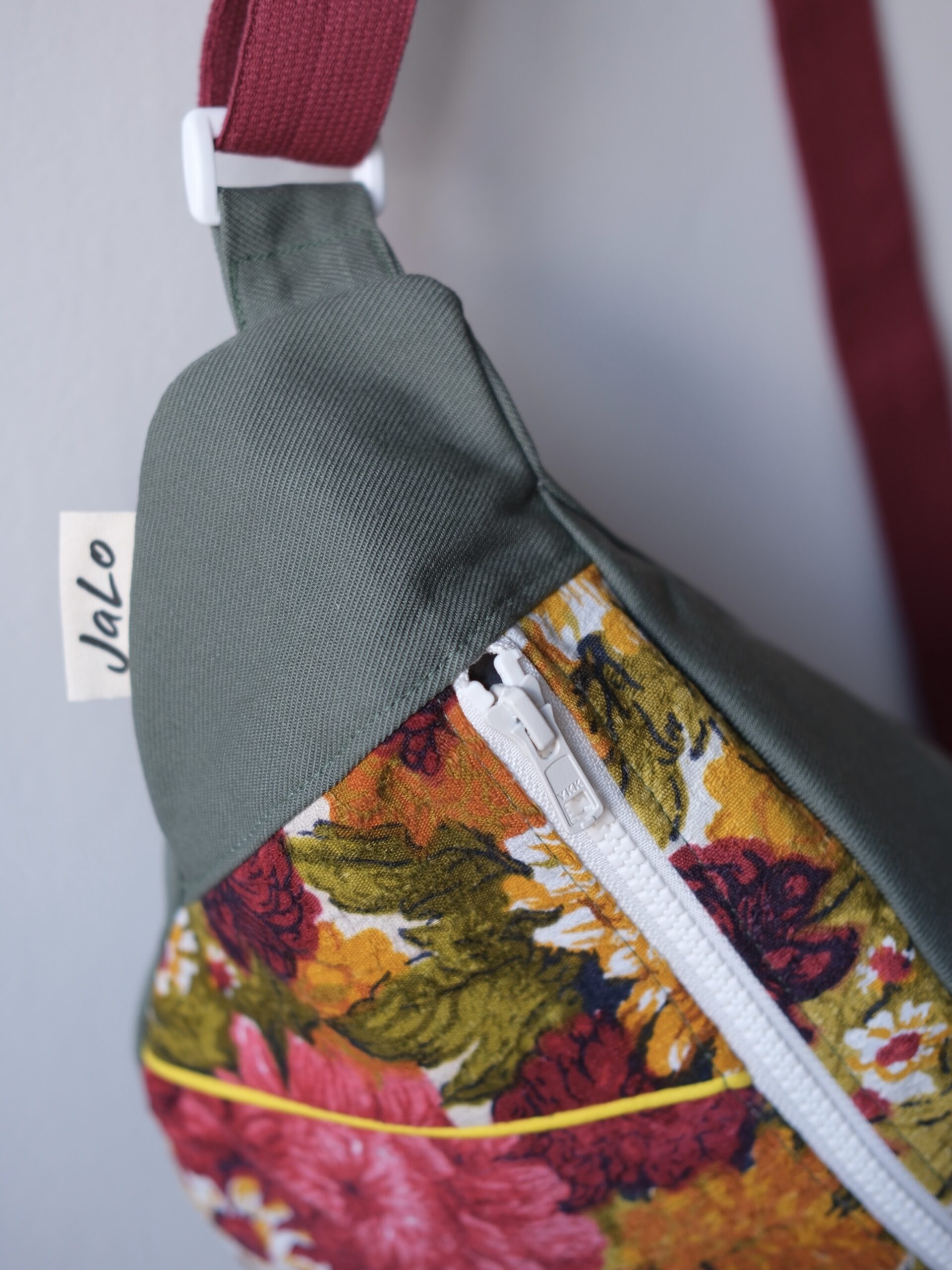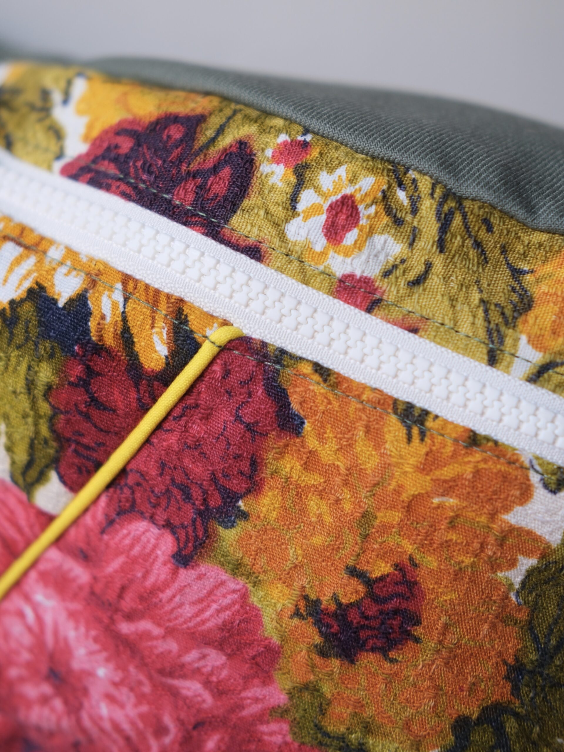 This totally vintage floral fabric, found in an Emmaus, made me think of the Canvas that many of our old aunts or grandmothers hung in a living room or a hallway (moreover, it’s time I got started because I have frames waiting to be taken down, washed and ironed before being transformed). The khaki fabric comes from a pair of military trousers, also vintage.