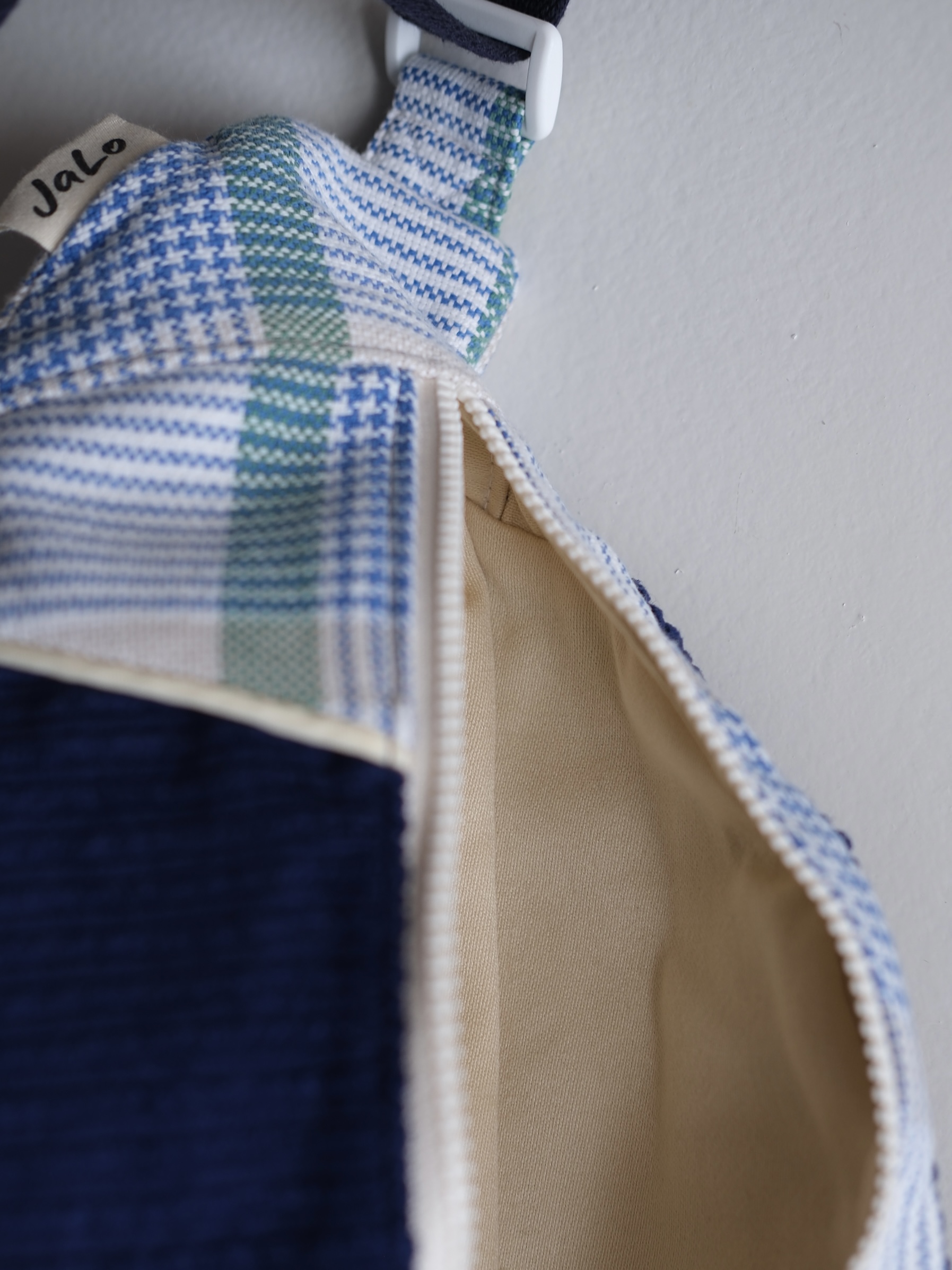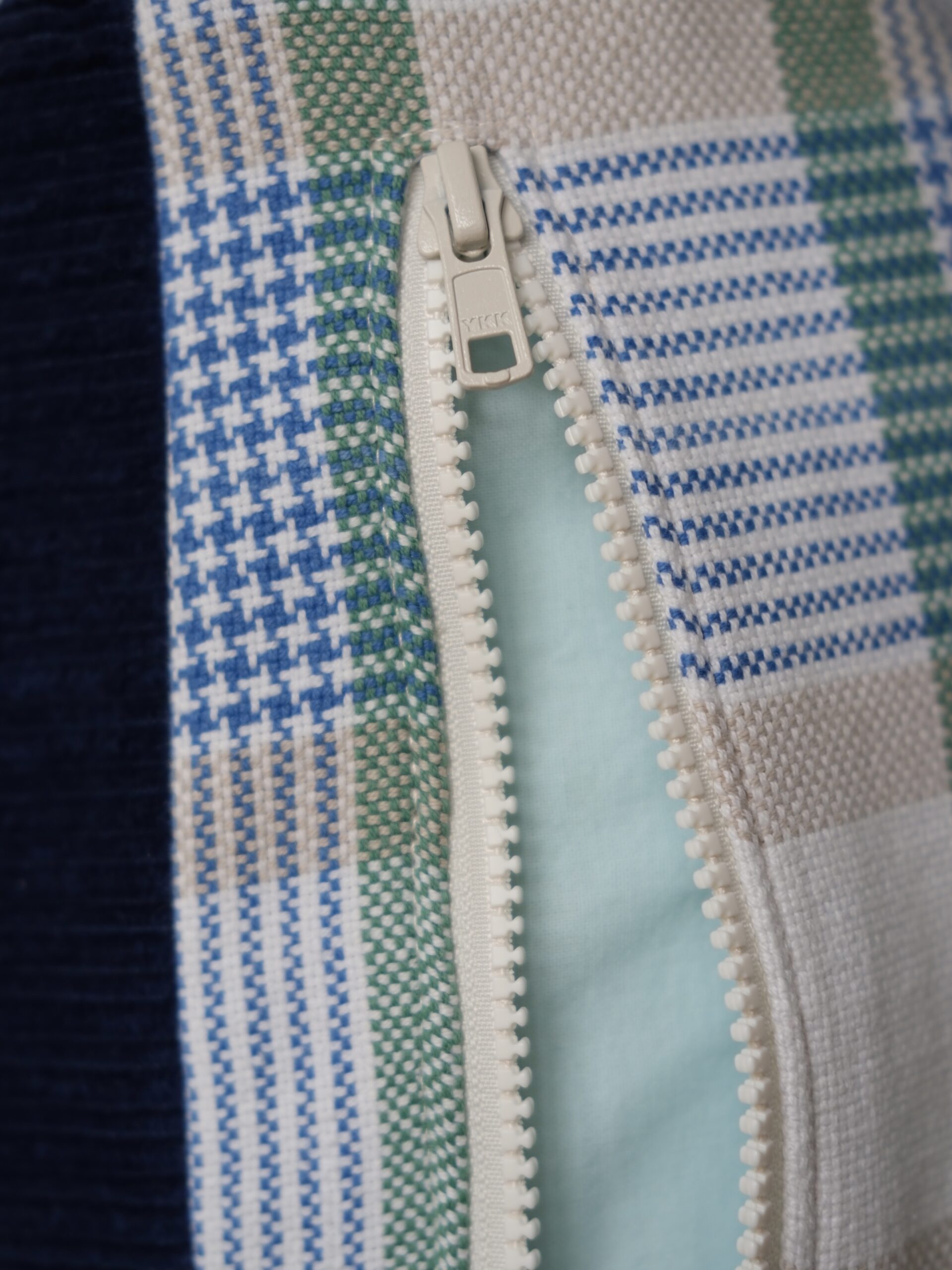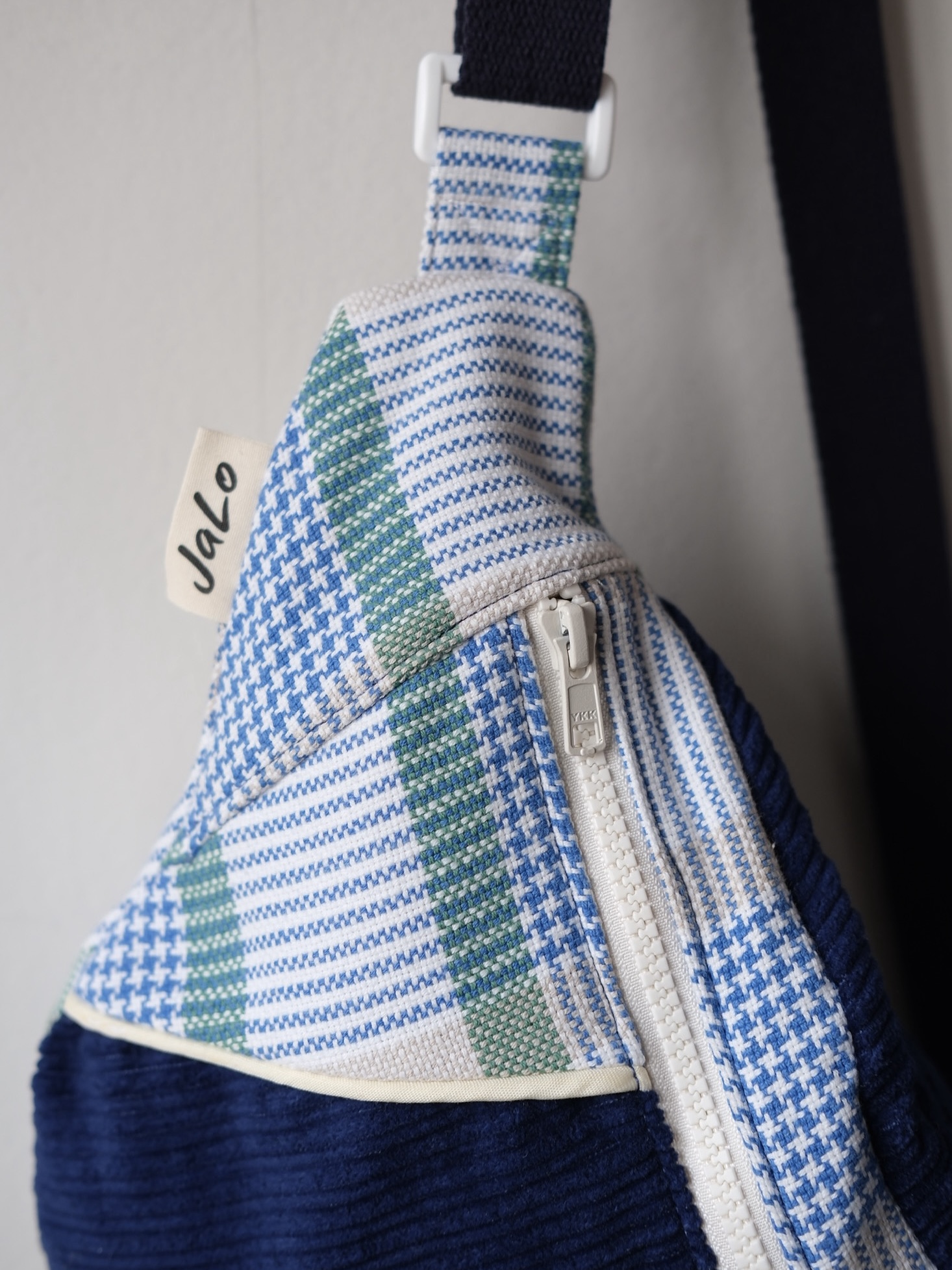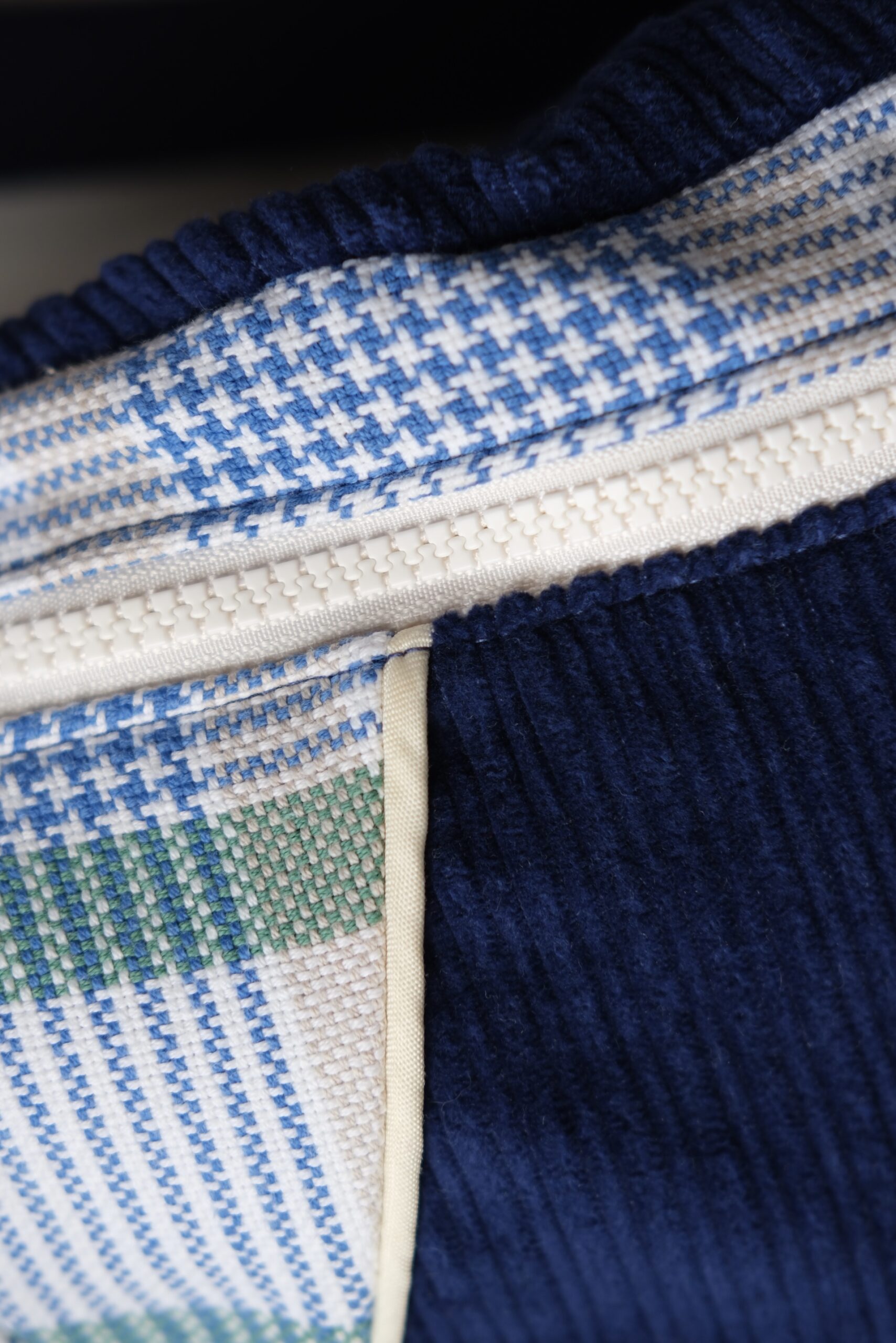 I used an old, thick, checkered cotton tablecloth that was badly stained. After several attempts at removing the stain, I finally managed to use it. The blue corduroy is a fabric I found in a small designer boutique in Paris and was waiting to be transformed. Done!